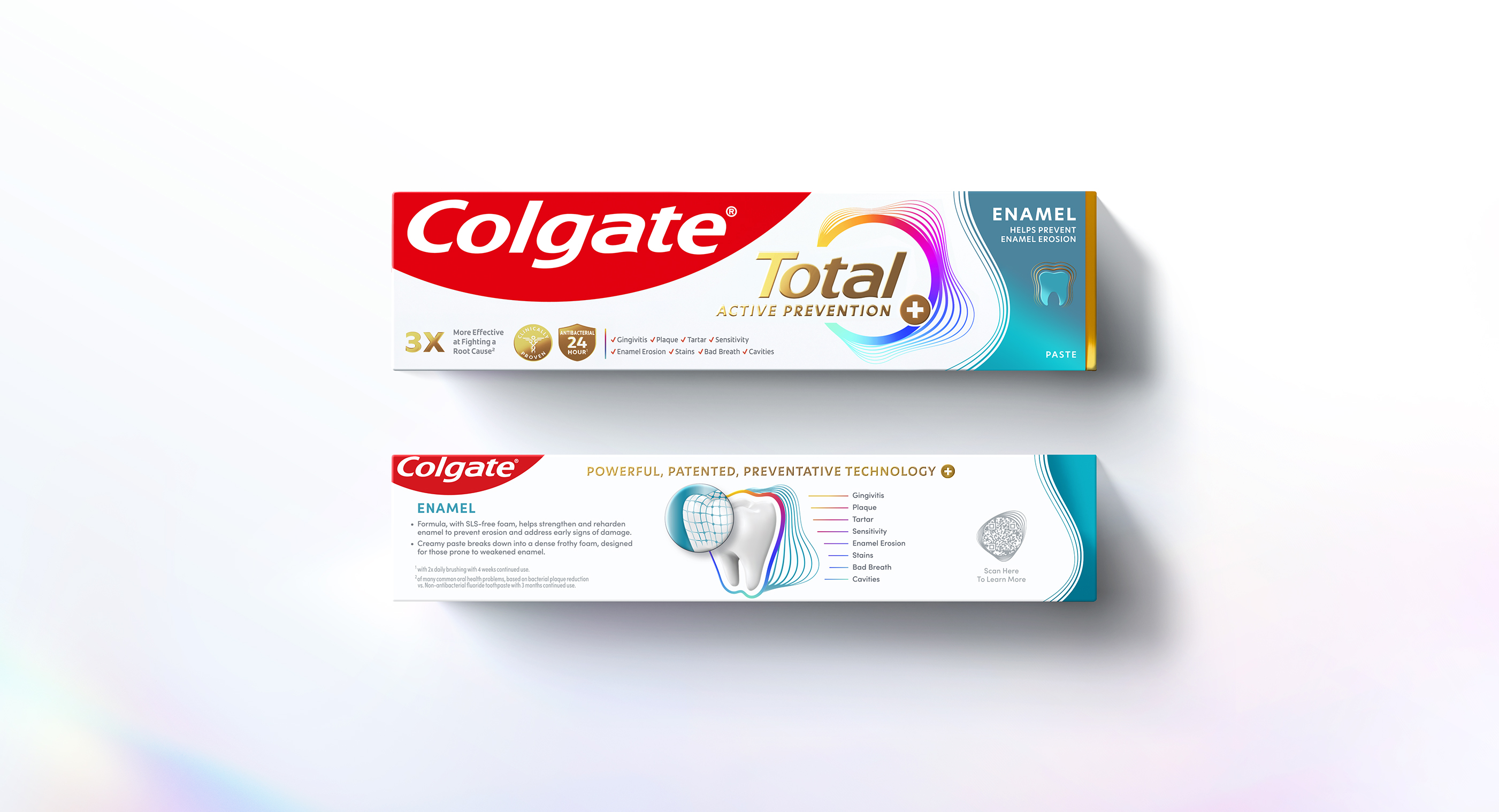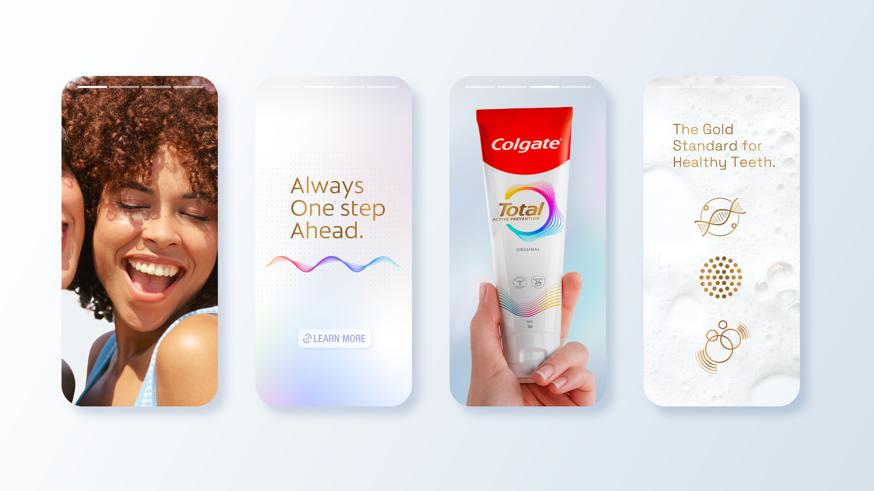 A revolutionary system of oral care, Colgate Total is designed to work with your mouth’s natural microbiome to stop issues before they start. The new identity translates the idea of “Active Prevention” into fluid motion and energy, building protective layers that encircle the logo, expressing clinical strength in a way that still feels both approachable and efficacious.
